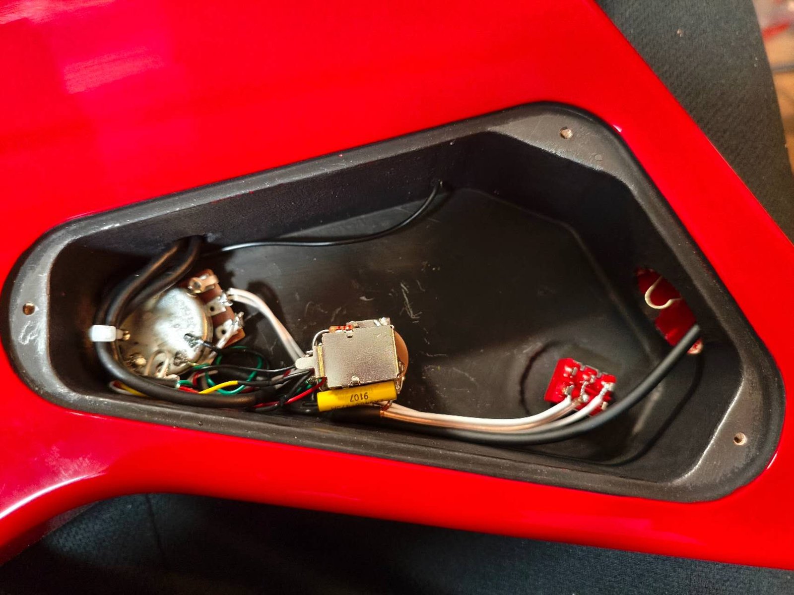 エレキギターの配線は、単に回路をつなぐための作業ではありません。同じ目的を果たすにも、配線の取り回し方やコンデンサーの配置には無数のバリエーションがあり、そこにはリペアマン一人ひとりの美学やセンスが表れます。最終的にはバックプレートで隠れて見えなくなる部分ですが、全体の配線バランスや美しさを追求することが、私のこだわりです。見えない部分こそ、職人の心が宿る場所だと思います。